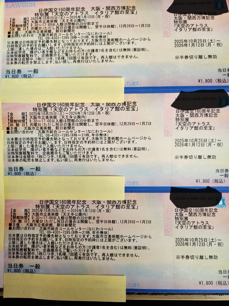 - 観覧券3枚 チケット 日伊国交160周年記念 大阪・関西万博記念 特別展「天空のアトラス イタリア館の至宝」EXPO2025 大阪市立美術館