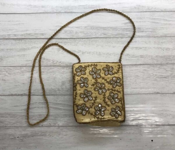 - レトロ オールド オリエンタル エスニック 花柄 ビーズ スパンコール 刺繍 円錐型 ポシェット ミニ ショルダーバッグ レディース 黄色