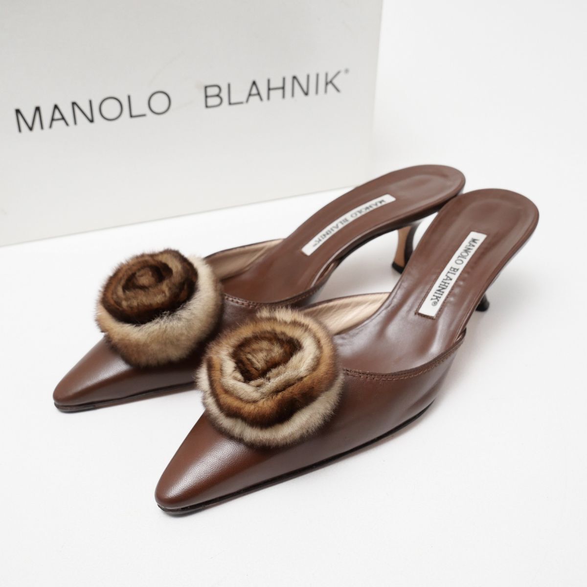 - GS4397△イタリア製 MANOLO BLAHNIK マノロブラニク ラビットファー 毛皮 レザー ポインテッドトゥ ミュール ブラウン系 38/24.0cm相当