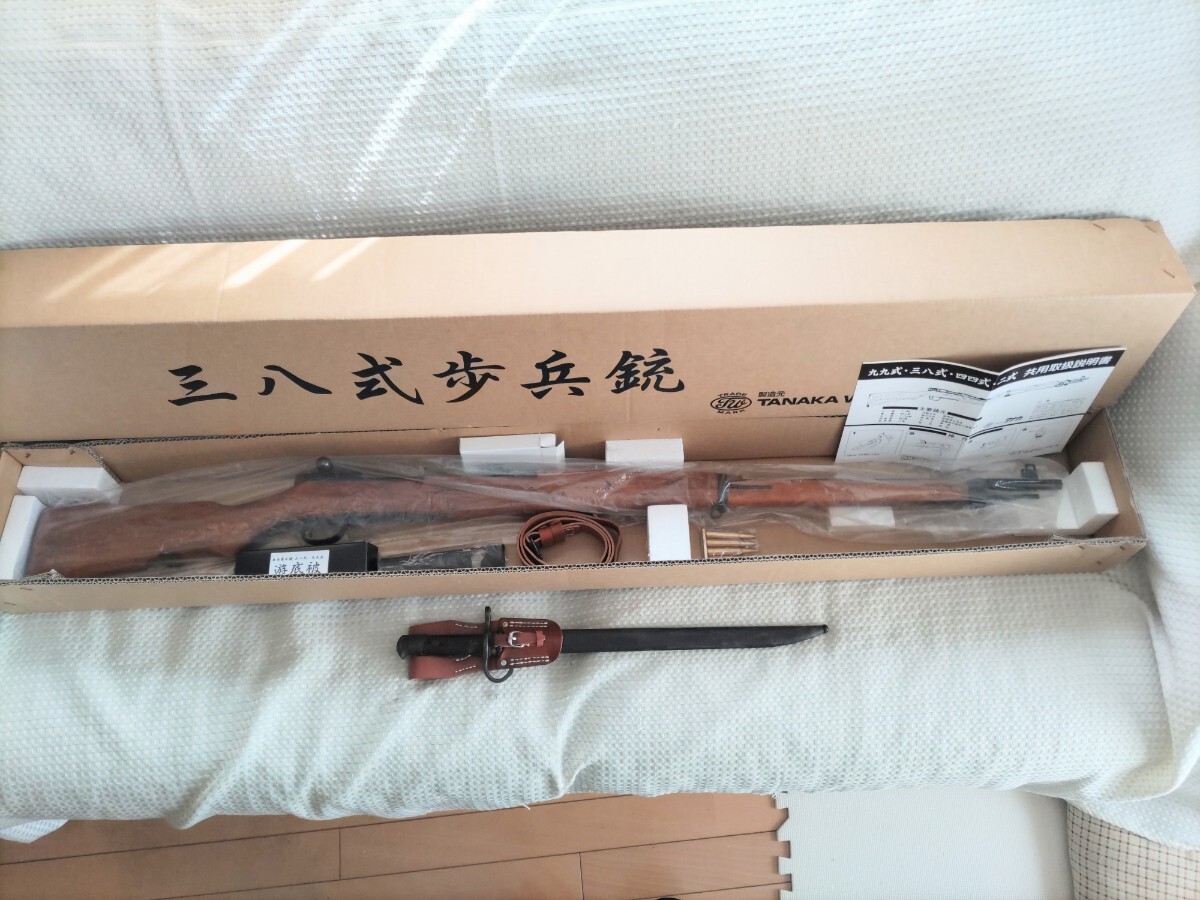 - 【ほぼ新品】美品 TANAKA三八式歩兵銃(カートリッジ、遊底被、革製スリング)+当時物三十年式銃剣鞘付+革製剣差し セット品