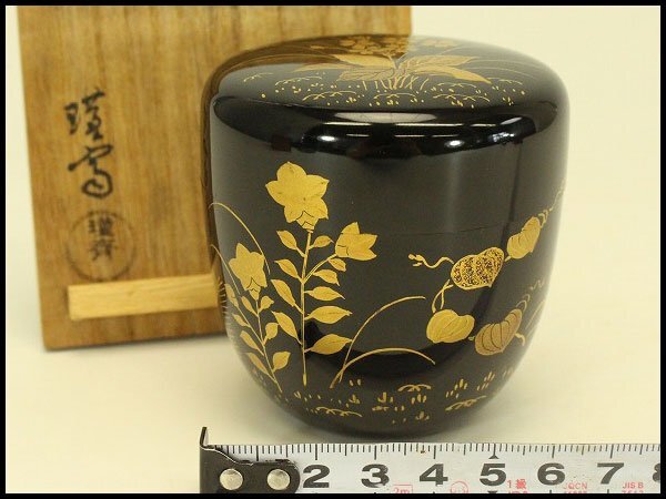- 【銀閣】茶道具 四季草花蒔絵 中棗 共箱 美品 旧家蔵出 送料無料(A949)
