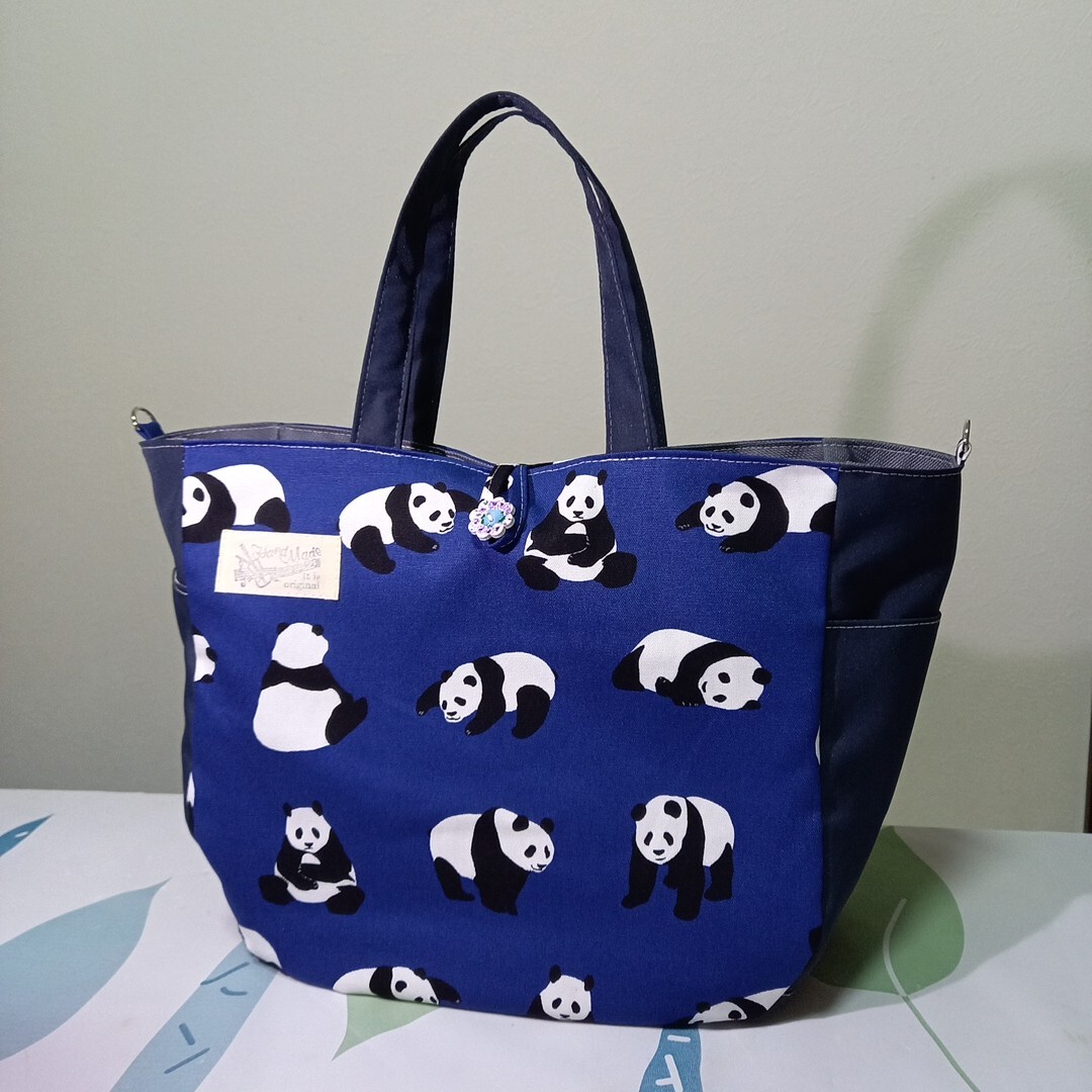 - パンダ 手提げトートバッグ2way Dカン付ショルダー可 サイドポケット ハンドメイド