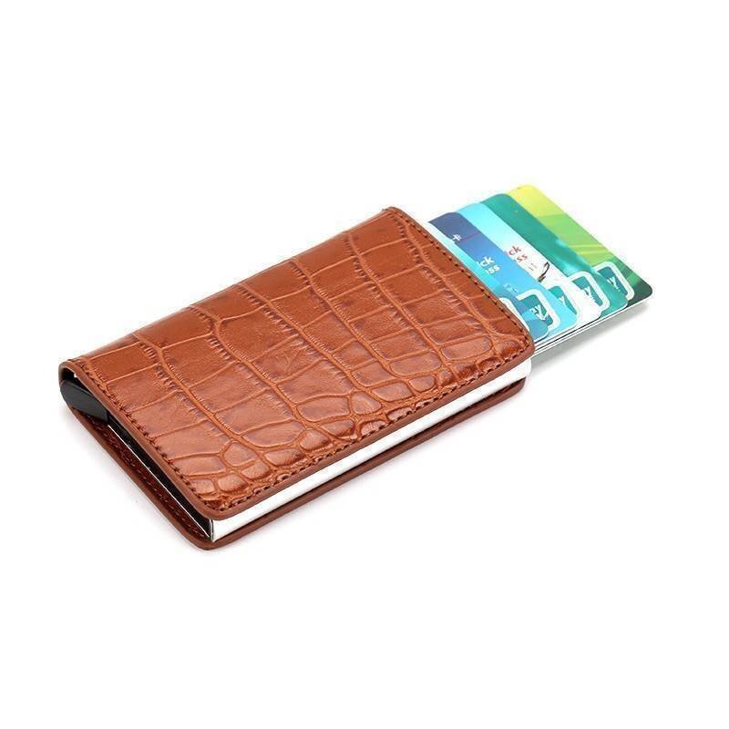 - 送料0円 カードケース 002 [クロコ調茶] スキミング防止 RFID マネークリップ メンズ レディース 薄型 スライド式 アルミ製 磁気防止