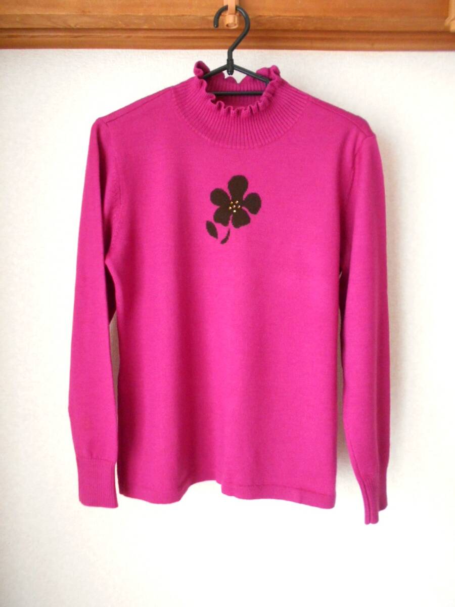 > ★美品★お花がついた薄手のセーター ウール100%(保温性が高く、軽くて触り心地もgood) ☆Мサイズ エンジピンク系色