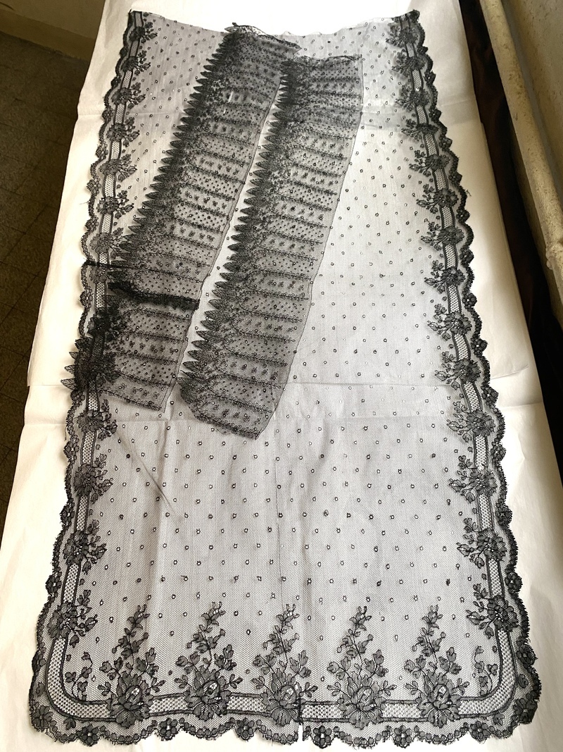 | ★商品説明 | ★とってもカッコ良く、エレガントで素敵なROSEのモチーフが施されている、BK(ブラック)レースです。写真8の2点のレースは、モチーフが細かく素敵なレースですが繋ぎ部分と写真9、10の様に解れがございますのでお付け致します。写真2のレースは、ショールとしてか、テーブルクロスの様に使われてきた様で、写真2の上部はカットされております。全体に水玉のモチーフが施されており、縁回りには、ロマンティックで素敵なROSEのモチーフ、そして縁取り部分には可愛らしいお花が施されたウェイヴフリルが施されております。エレガントでロマンティックな雰囲気がとっても素敵です。但し、写真5の部分に3cm程と0.5cm程、写真6、7の部分に小さいですが、よくご覧頂きますと解れがございます。ご了承願います。ロマンティックでとっても可愛らしく、そしてエレガントでとっても素敵です。♪ ★大きさは、写真2のレースが幅41×長さ83、写真8のレース2点が、幅10.5×長さ48、54㎝程です。ご活用下さいませ