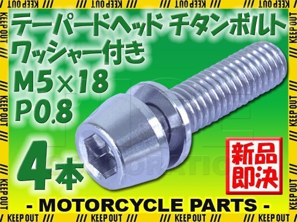> メール便OK!M5×18 P0.8 チタンボルト 4本セット 5mm 18mm ピッチ0.8 ワッシャー付き シルバー テーパー ボルト ステム バイク 車 自転車