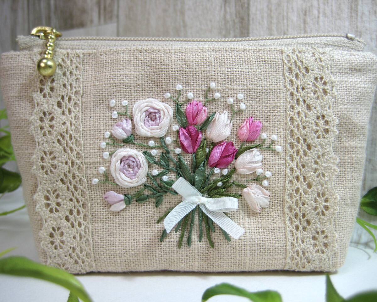 > ★ハンドメイド★シルクリボン手刺繍ミニポーチ★アクセサリー・小物入れ・コスメ・ピルケース★
