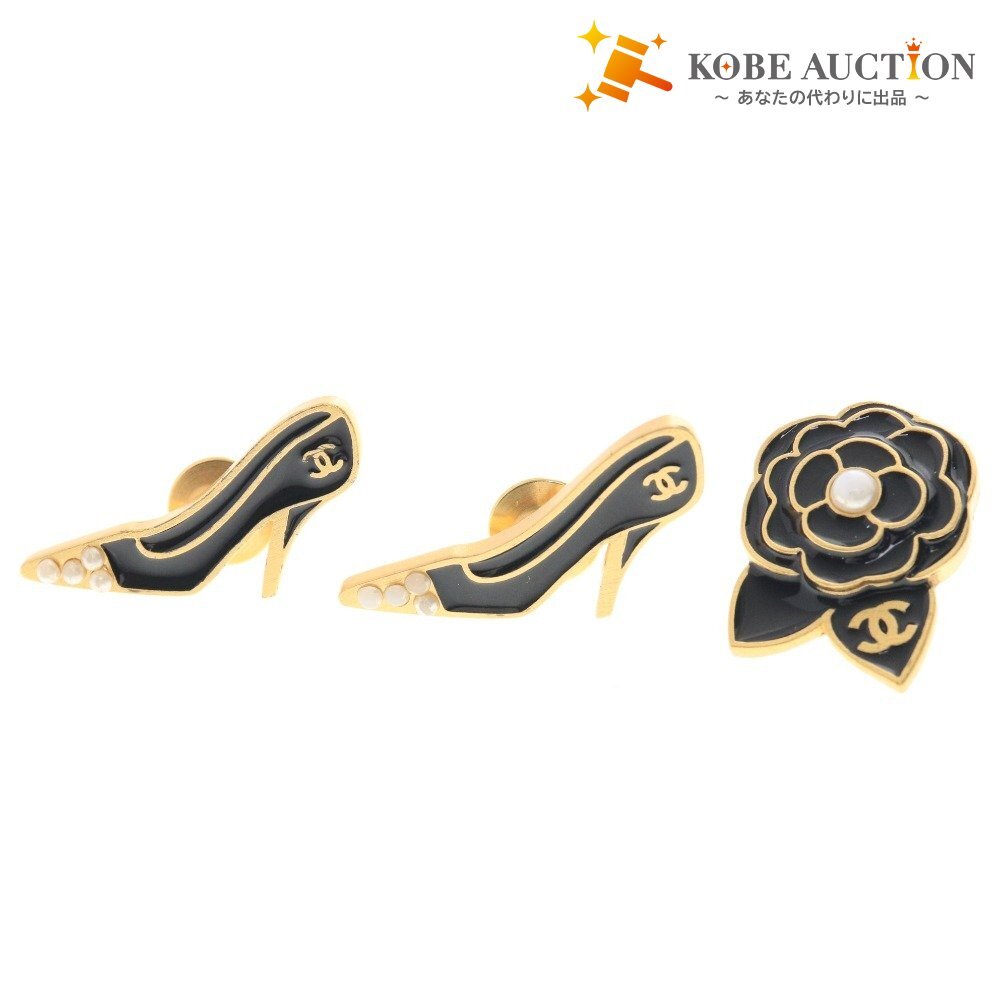 > ■ シャネル ブローチ 3点セット まとめ売り カメリア 花 ヒール パンプス パール ココマーク 総重量20g ゴールド ブラック 付属品付き