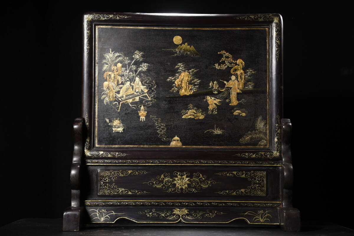- 旧 清代 大尺寸 老木胎描金漆器四雅圖插屏 中国古美術 古賞物 古置物 唐物 K711