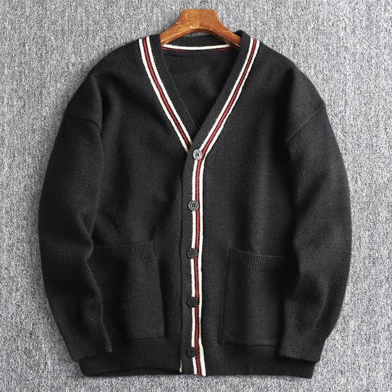 - 新品 上質 ウール カーディガン Vネック ストライプ柄 ジャガード ニットアウター メンズ 秋冬 柔らかい 保温 ウールセーター 黒 T6146-2XL
