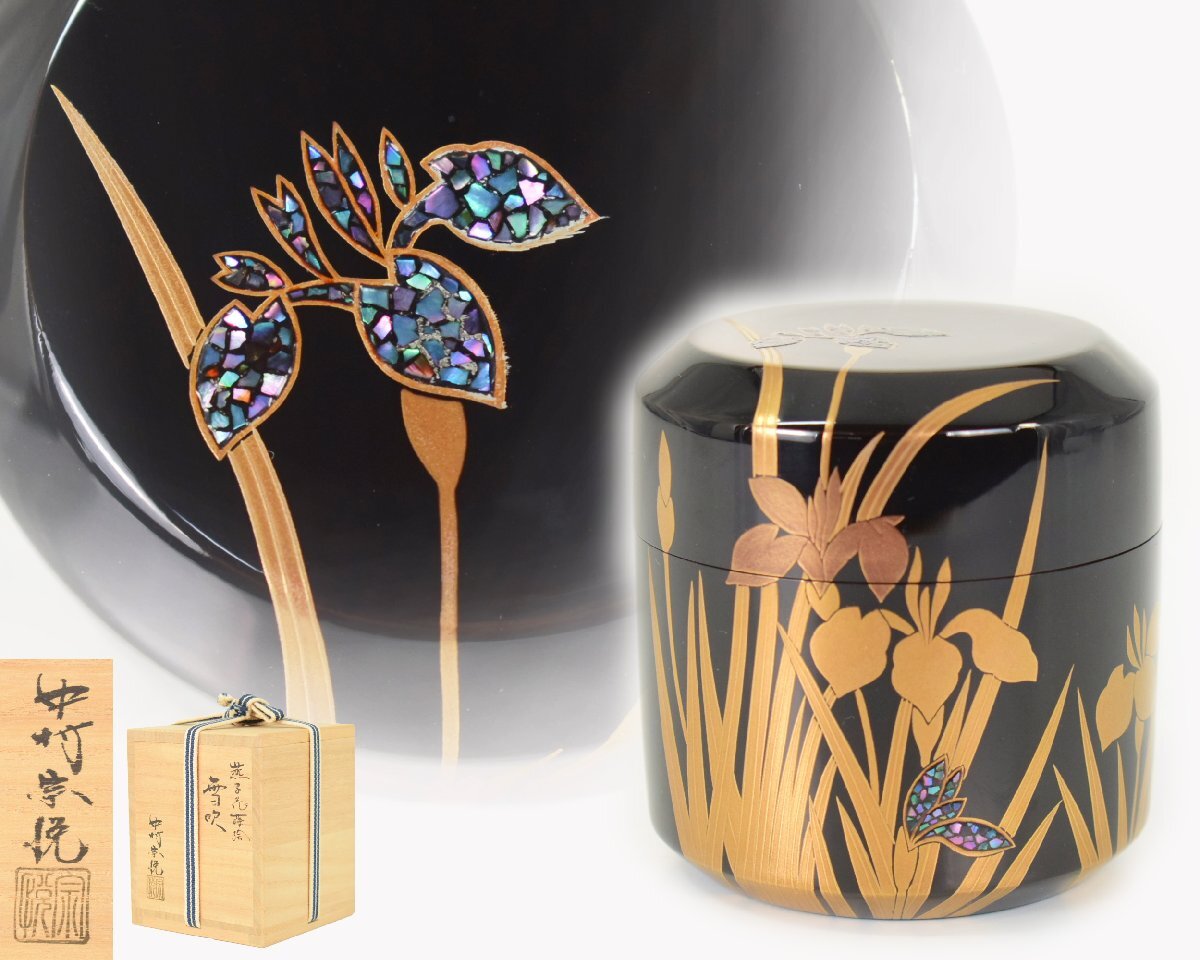 中村宗悦作 螺鈿細工 燕子花蒔絵 雪吹棗で御座います。
