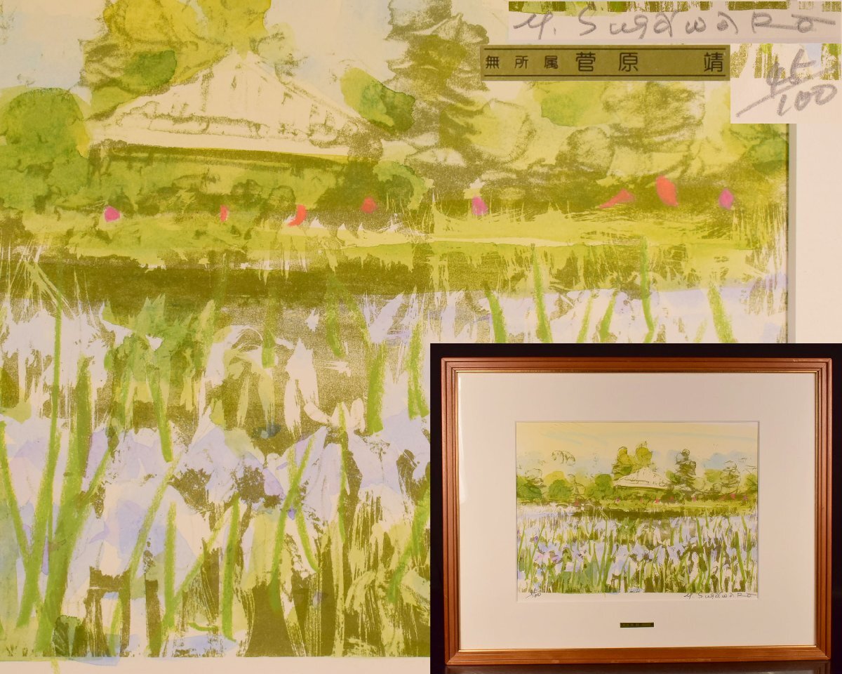 T932 【泉美】菅原靖作「花菖蒲」40/100 リトグラフ+手彩色 版画 絵画 額 壁掛け アート拍卖