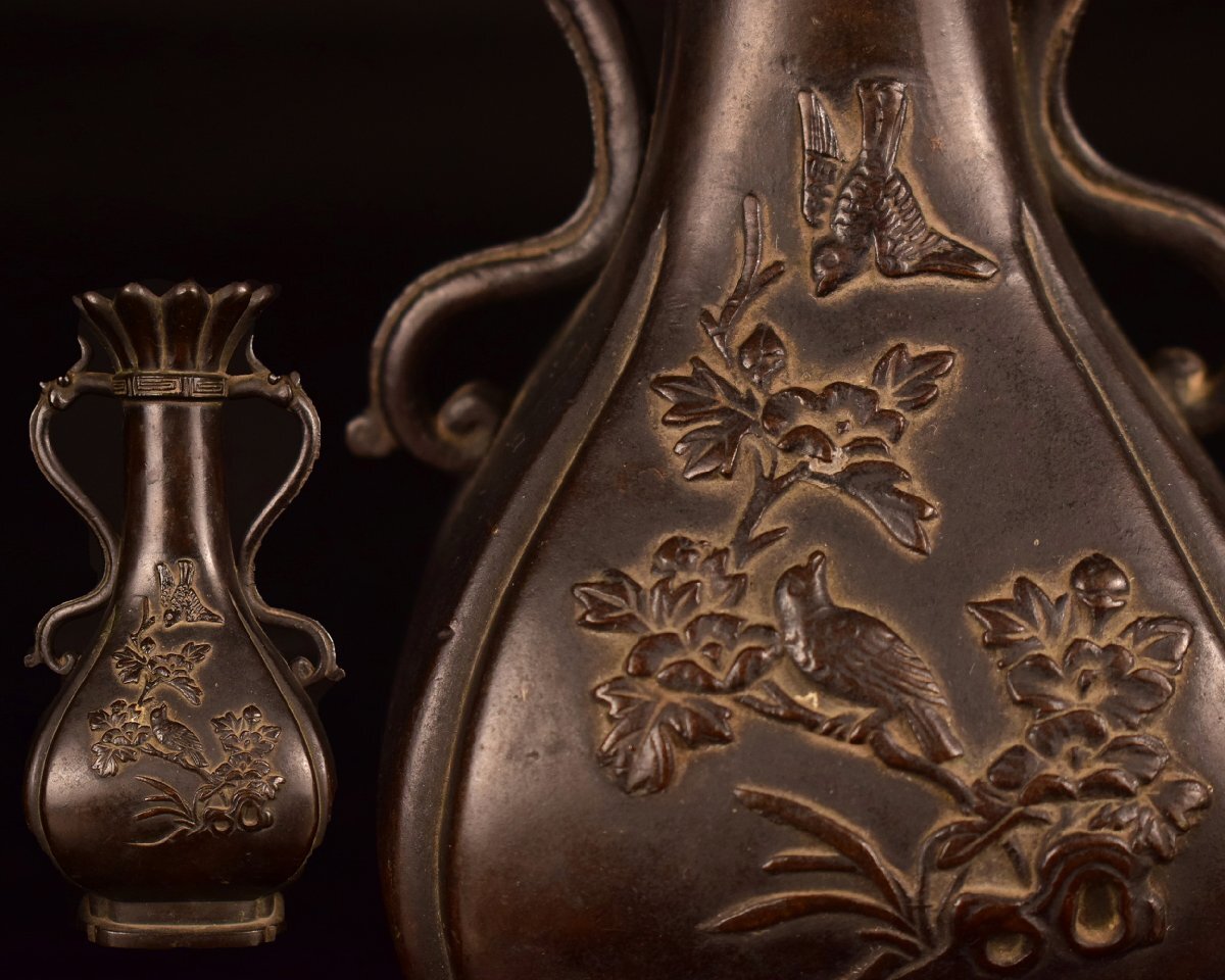 X508 【泉美】銅製 花鳥図 耳付花瓶 花入 花生 花器