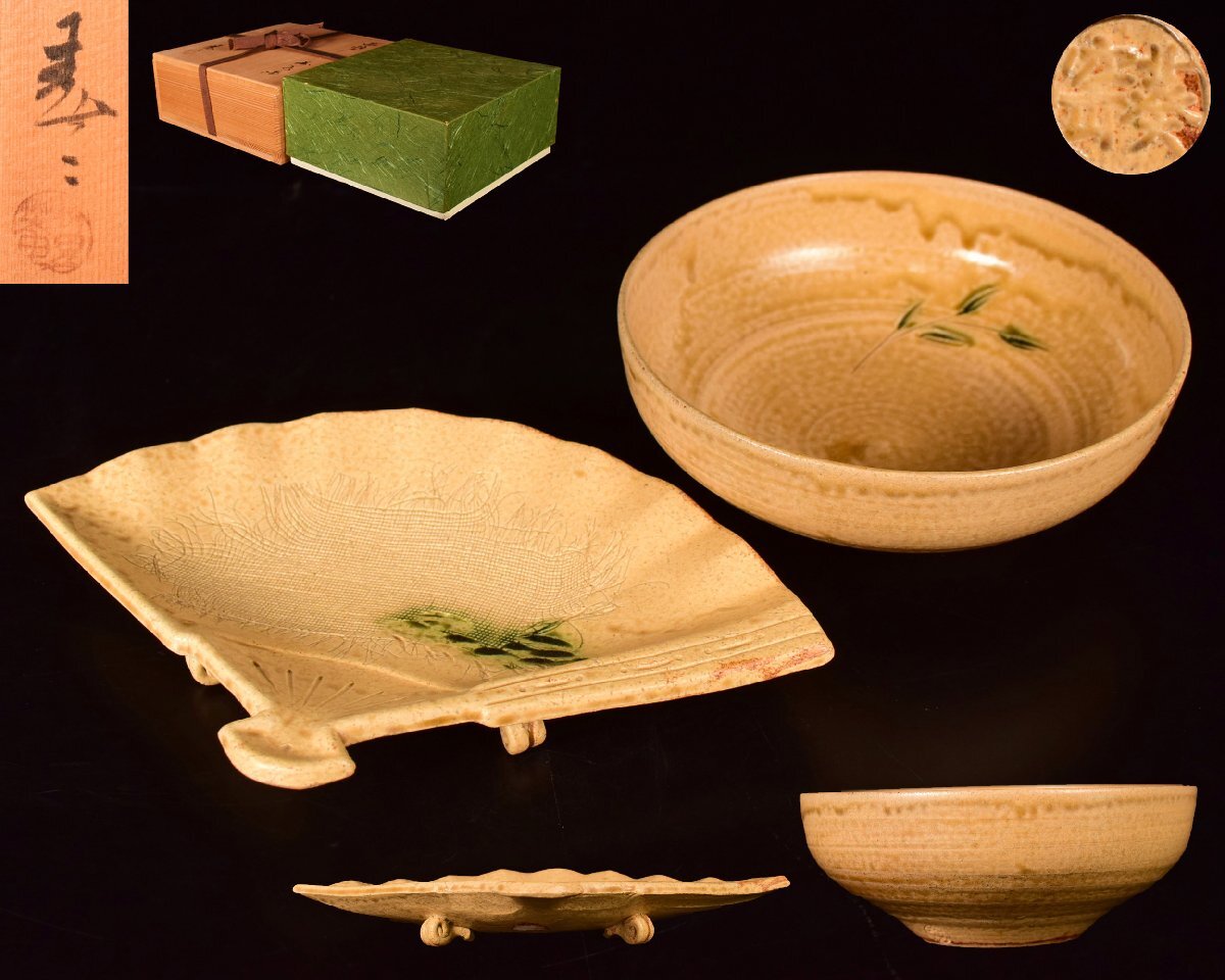 X899 【泉美】葵窯 加藤春二作 黄瀬戸 扇皿 鉢 2点 菓子鉢 菓子器 共箱入拍卖