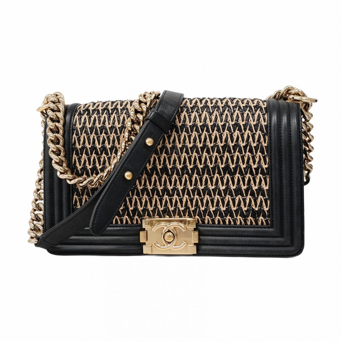 > ★最終価格★SALE【5mb2381-h】シャネル ショルダーバッグ ボーイシャネル チェーンショルダー ラムスキン ストロー ブラック ゴールド金具