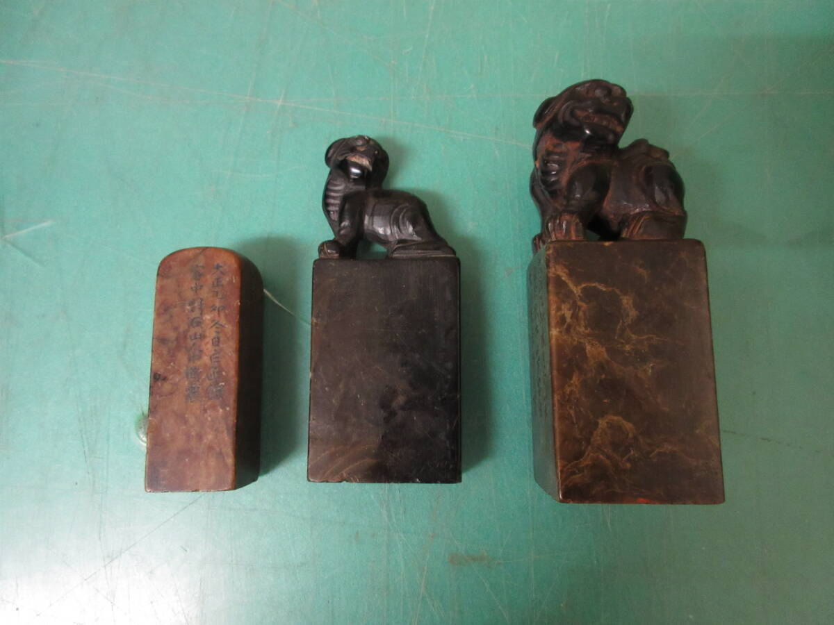 - ★レトロ 印章3点セット 獅子彫刻 石製印章 古印鑑 落款印 篆刻用 一部破損あり★
