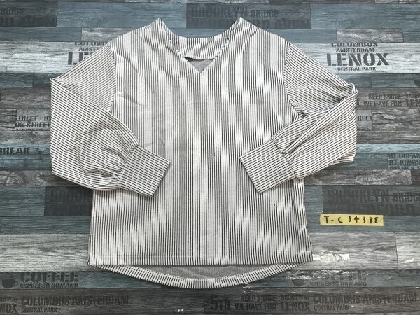 - レディース ストライプ柄 Vネック サイドスリット プルオーバーカットソー M 白黒