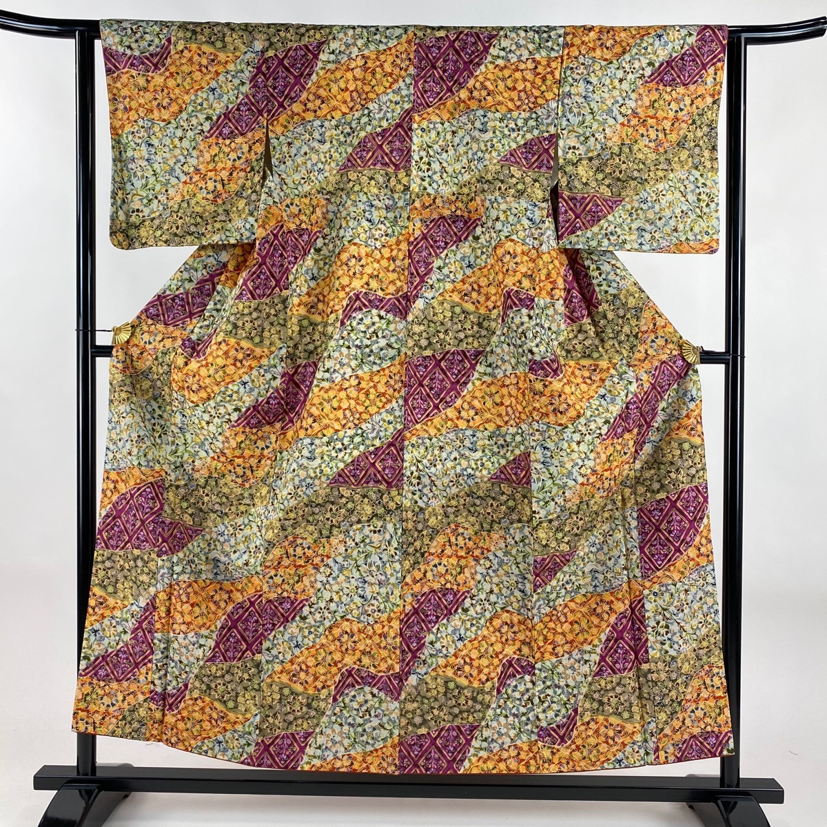 - 小紋 身丈153.5cm 裄丈62.5cm S 袷 草花 菱 オレンジ 正絹 名品 【中古】