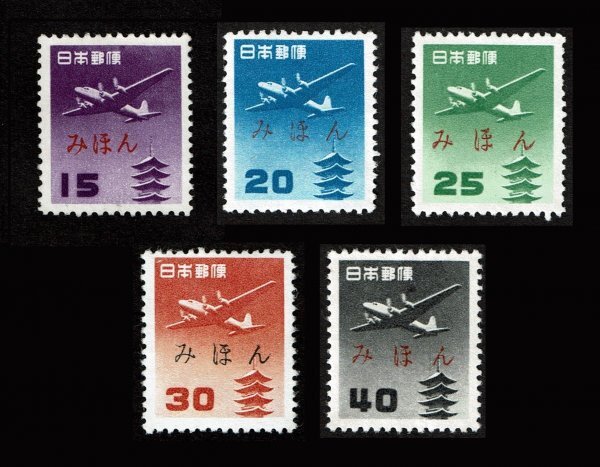 - P412■【みほん字入り・糊落ち】1952年 航空切手 五重塔航空(円位) 5種完■希少・良好