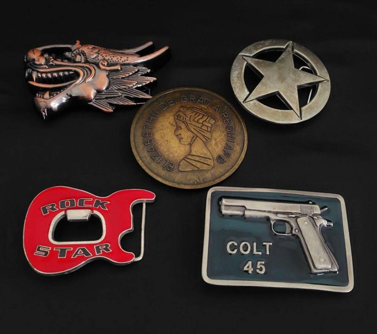 - ヴィンテージ ベルトバックル 5個セット『コルト45』『エリザベスコイン』『ROCK STAR』『ドラゴン』『カウボーイスター』