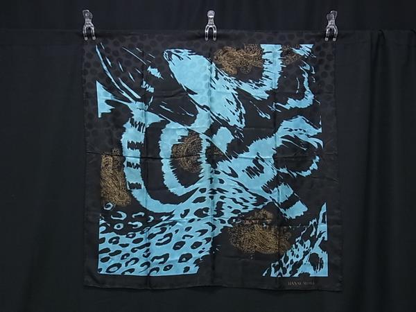 > HANAE MORI ハナエモリ シルク100% 豹 レオパード柄 ペイズリー柄 大判 スカーフ ストール ショール ブラック系×ブルー系 DJ2064