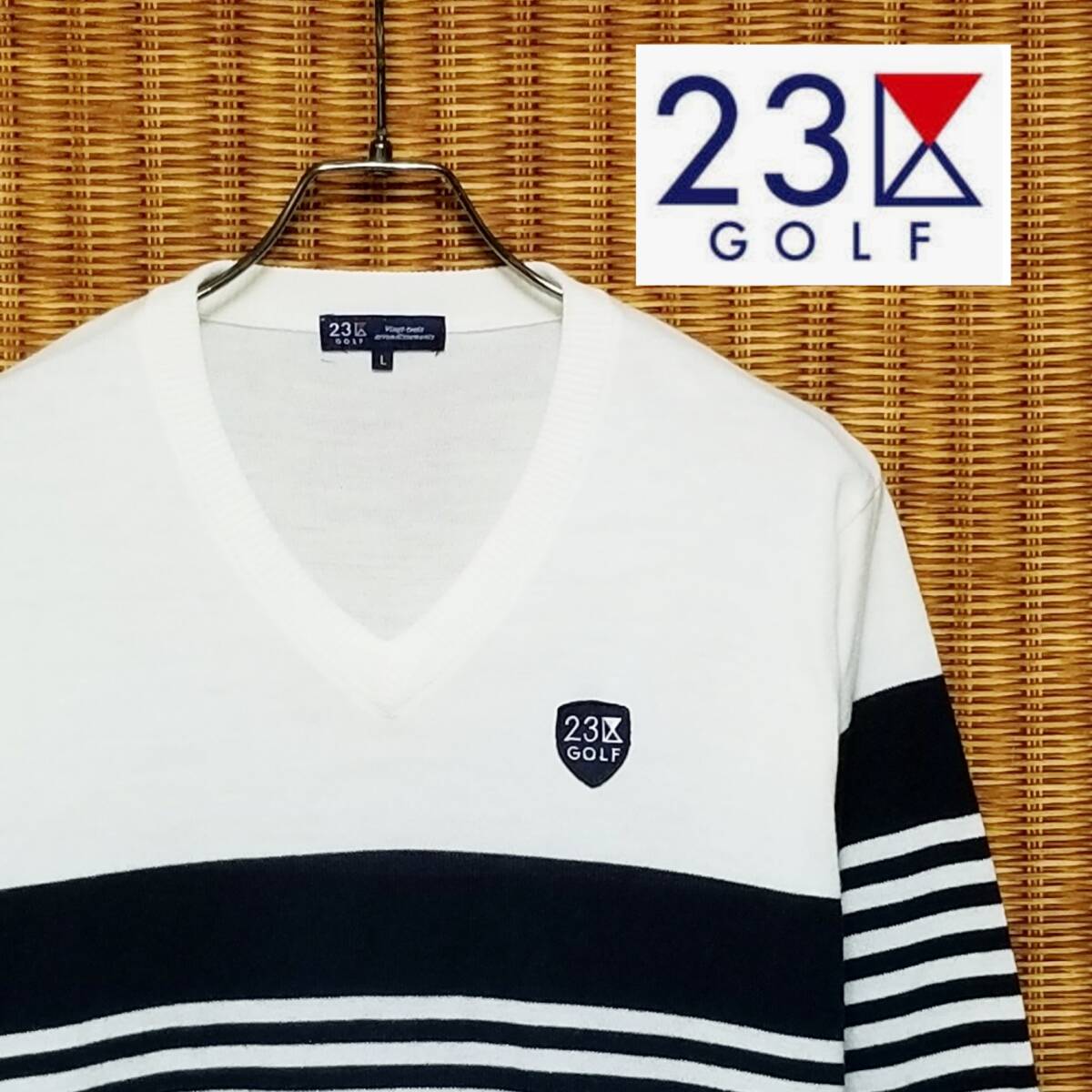 > 【美品】◎ 23区GOLF ニジュウサンク ゴルフ/ 長袖 ワンポイント刺繍ロゴ ボーダー柄 Vネック ニットセーター SIZE: L オフホワイト