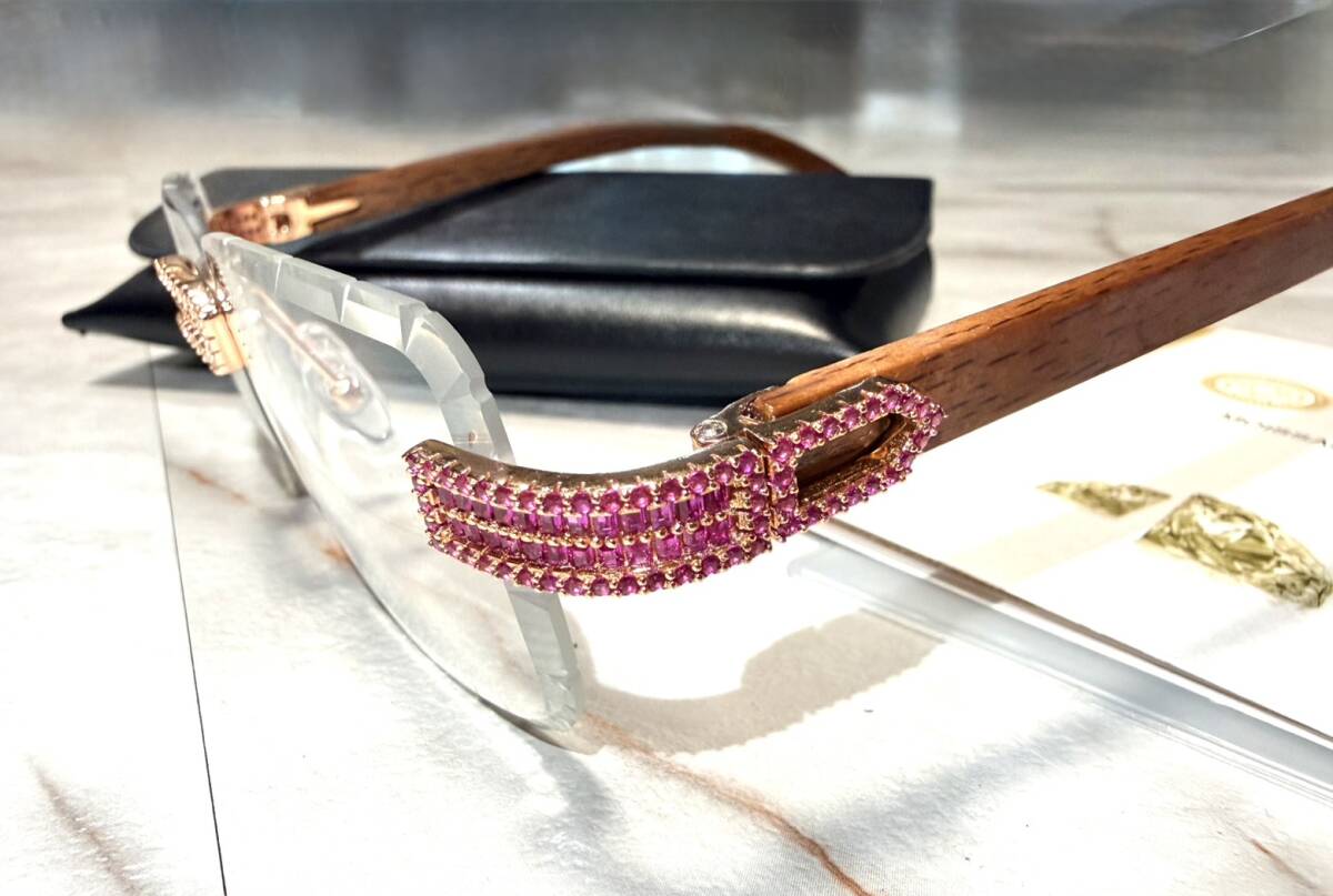 > 【保証書付き!ミステリーセッティング】バケット ダイヤモンド カット & ルビー 色 モアサナイト K18 GF サングラス 眼鏡 メガネ ダイヤ