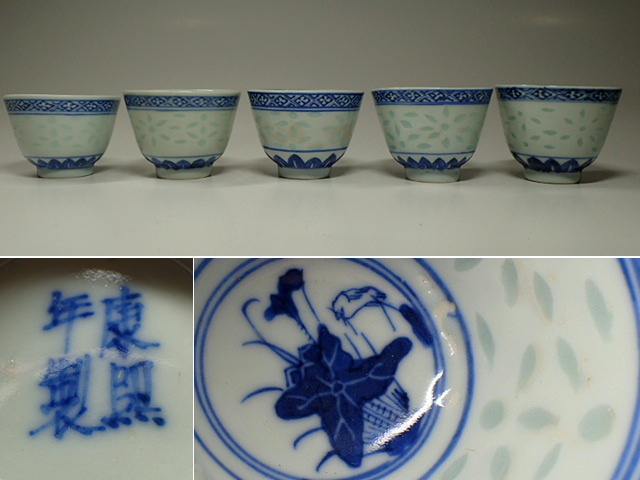 - 中国古玩 康熙年製 青華 蛍手 煎茶碗 五客 唐物 煎茶道具
