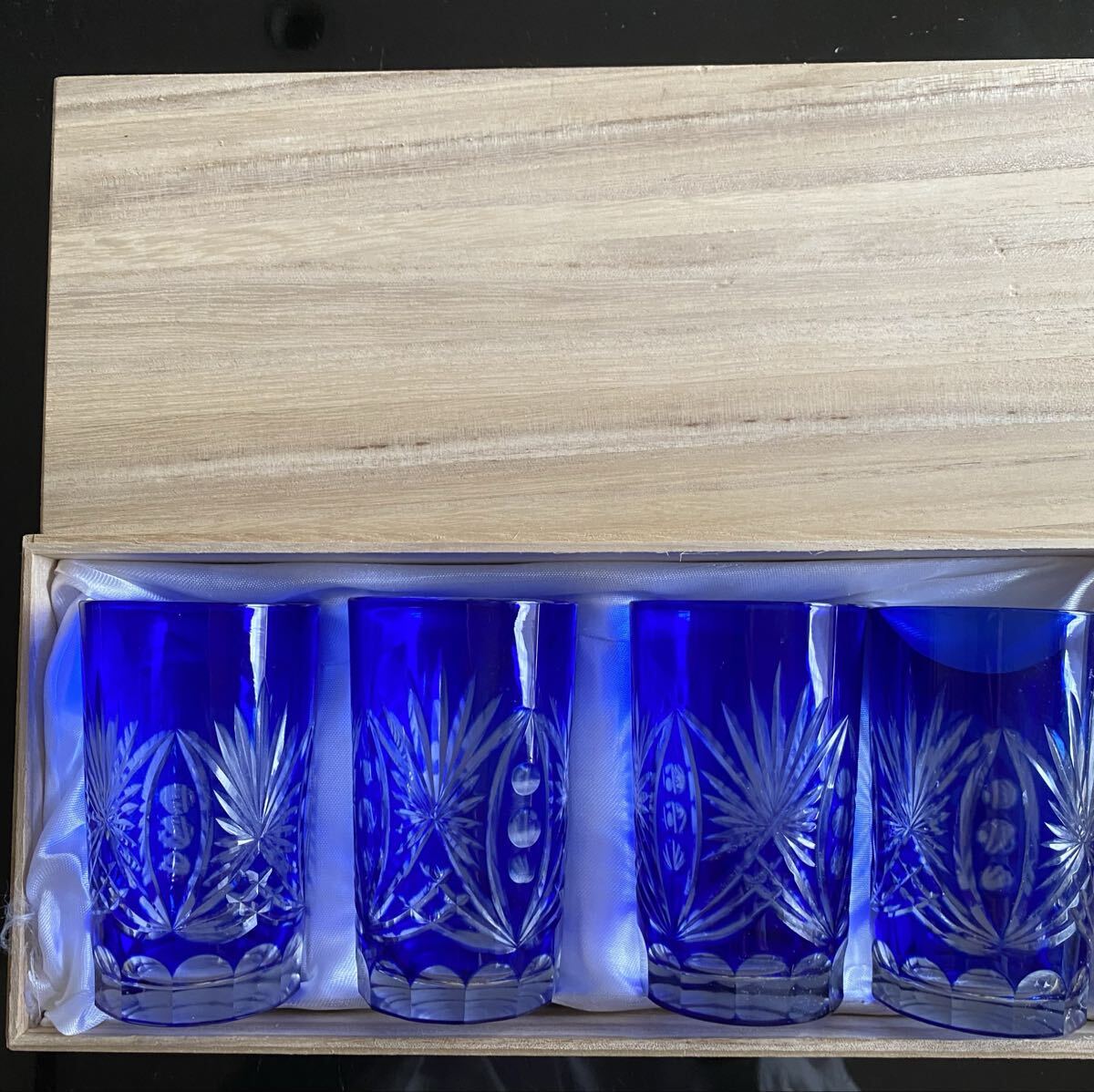 - 新品未使用品◆切子グラス 4個セット 木箱入り カットガラス コップ 藍色 ビアグラス タンブラー 切り子