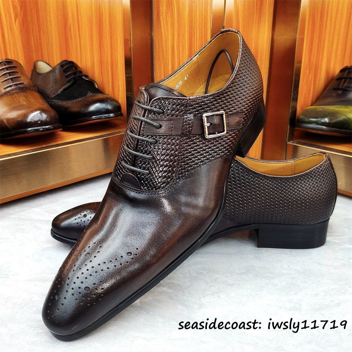 - 最上級*新品 メンズ オックスフォード 本革 ビジネスシューズ 職人手作り 牛革レザーシューズ メタルバックル 革靴 紳士靴 ブラウン 25.5cm
