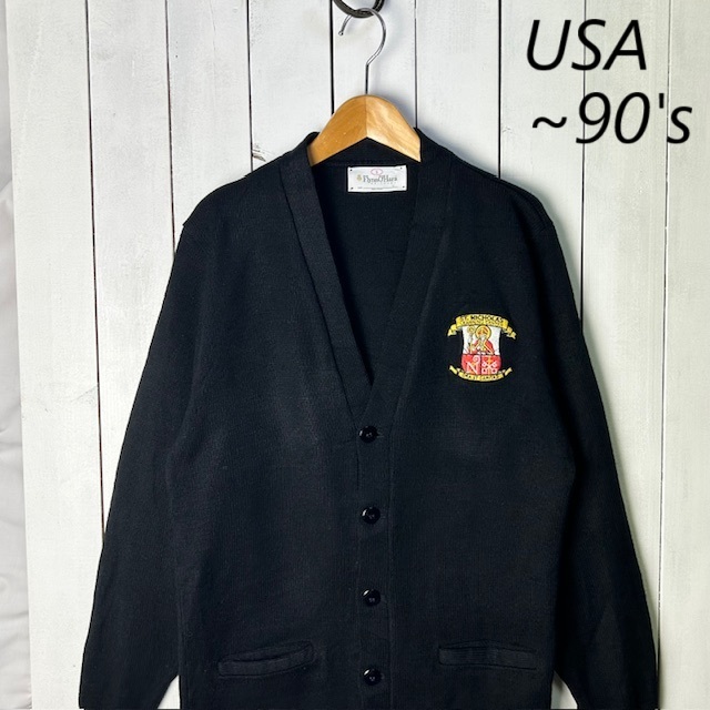 - USA古着 90s アクリルニットカーディガン 黒 S オールド ヴィンテージ アメリカ古着 レタードカーディガン メキシコ製 刺繍ワッペン ●308