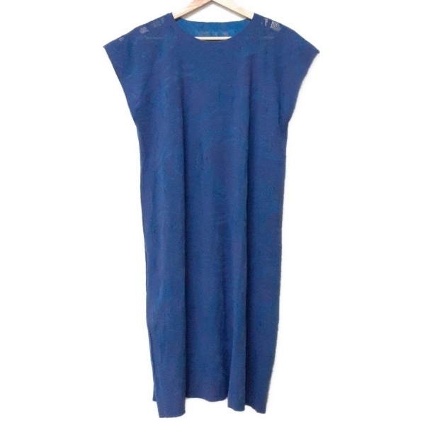 > プリーツプリーズ PLEATS PLEASE - ブルー×ネイビー レディース クルーネック/ノースリーブ/ロング/メッシュ/総柄 美品 ワンピース
