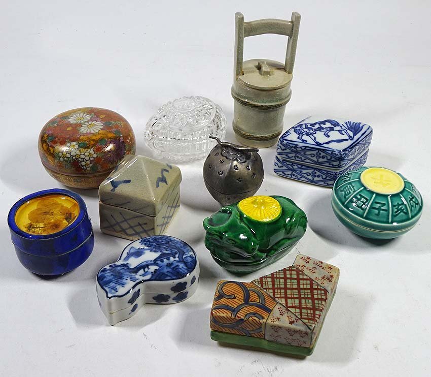- 緑屋s■ 香合 まとめて 11点 陶製 金属製 硝子製 染付 色絵 茶道具 mae/10-274/29-9#80