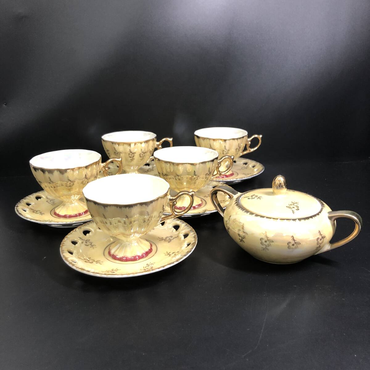 > 【ヴィンテージ】ラスター彩/金彩 ティーカップ&ソーサー メッシュ 5客 シュガーポット 計6点セット
