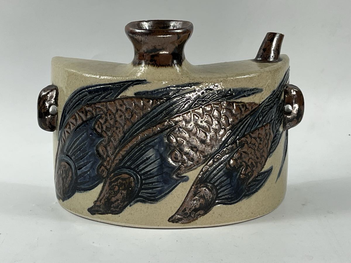 - 琉球 壺屋焼 抱瓶 酒器 徳利 魚文 やちむん 検金城次郎 沖縄 魚紋【博圓】幅19cm