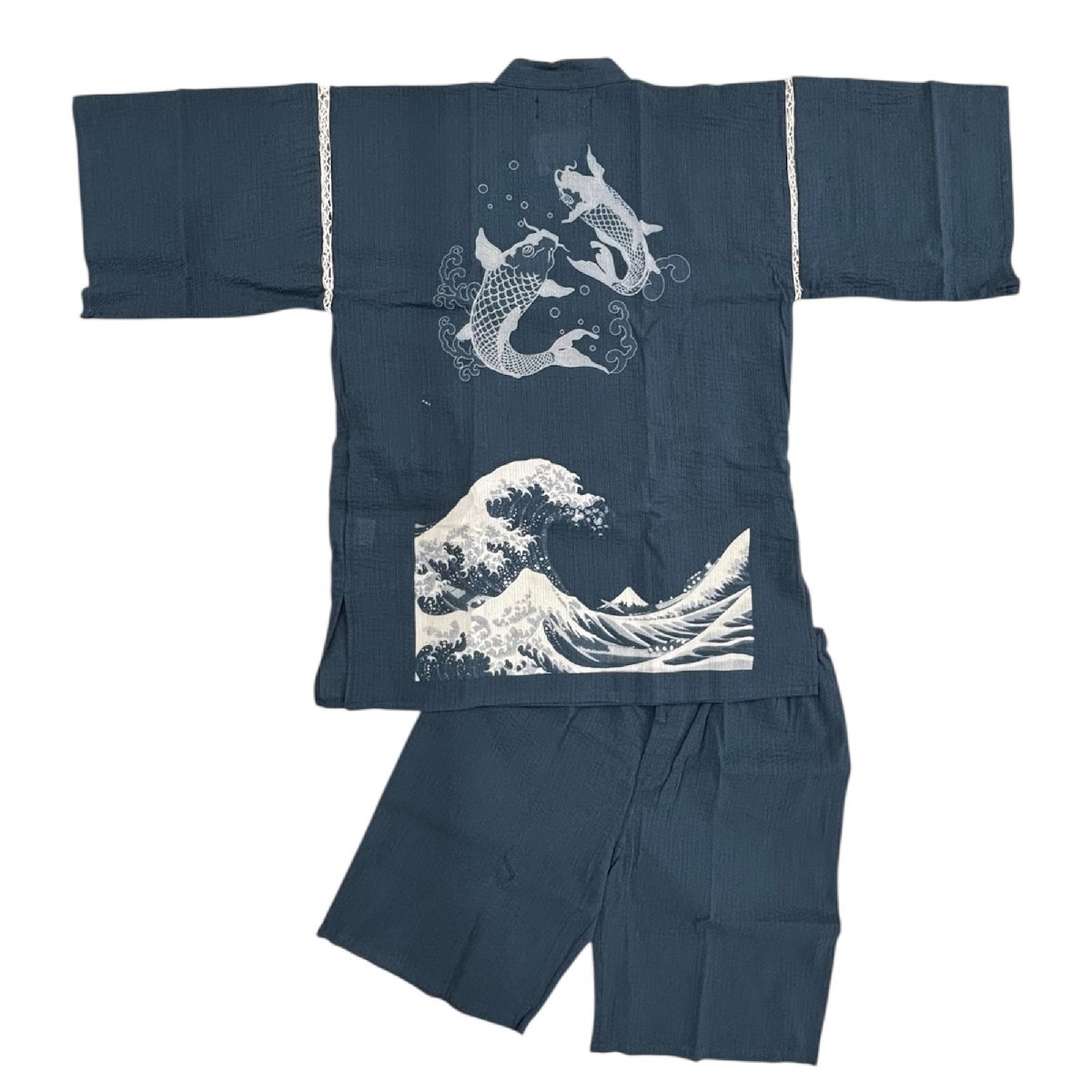 - [江戸てん] 訳あり半額 甚平 しじら織り 涼しい 夏 綿100% 抜染プリントオリジナル柄 メンズ 波と双鯉 紺 L