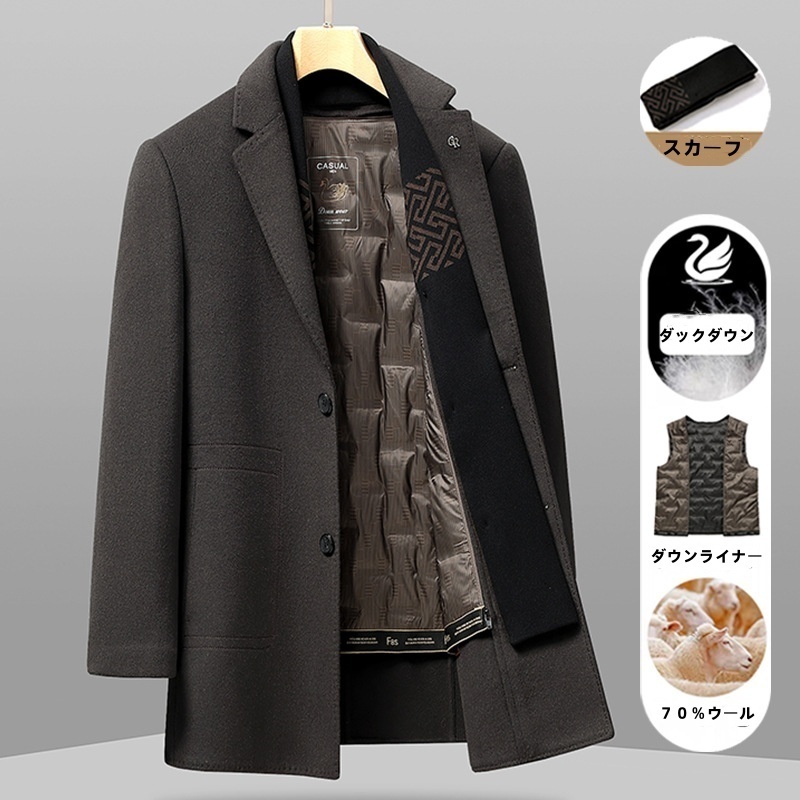 - チェスターコート ウールコート ダウンコート メンズ★新品 ダウンライナー ビジネスコート スカーフ襟付き アウター【8668】珈琲色 M