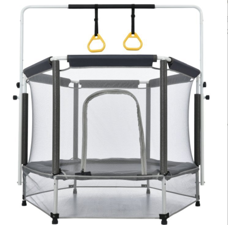 > 【国内発送】トランポリン 子供用 安全保護ネット付き 幅140(55inch) 高さ3段階調節 安全ネット付き 鉄棒 吊り輪付き 安全カバー セーフ