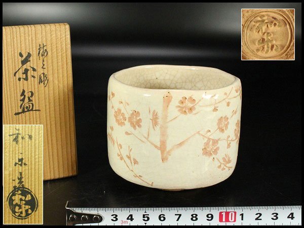 > 【金閣】茶道具 白楽 梅彫 筒 茶碗 和楽作 共箱 旧家蔵出 送料無料(A350)