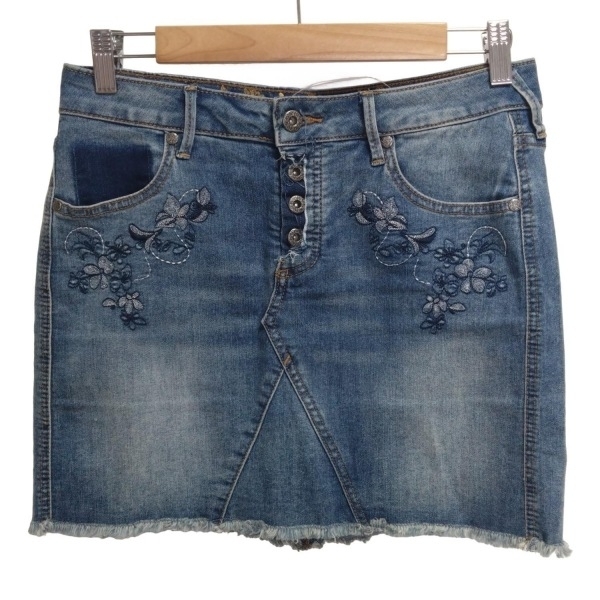 > デシグアル Desigual ミニスカート サイズ28 L - ブルーグレー レディース デニム/刺繍/ラメ/フラワー(花)/ボタンフライ ボトムス