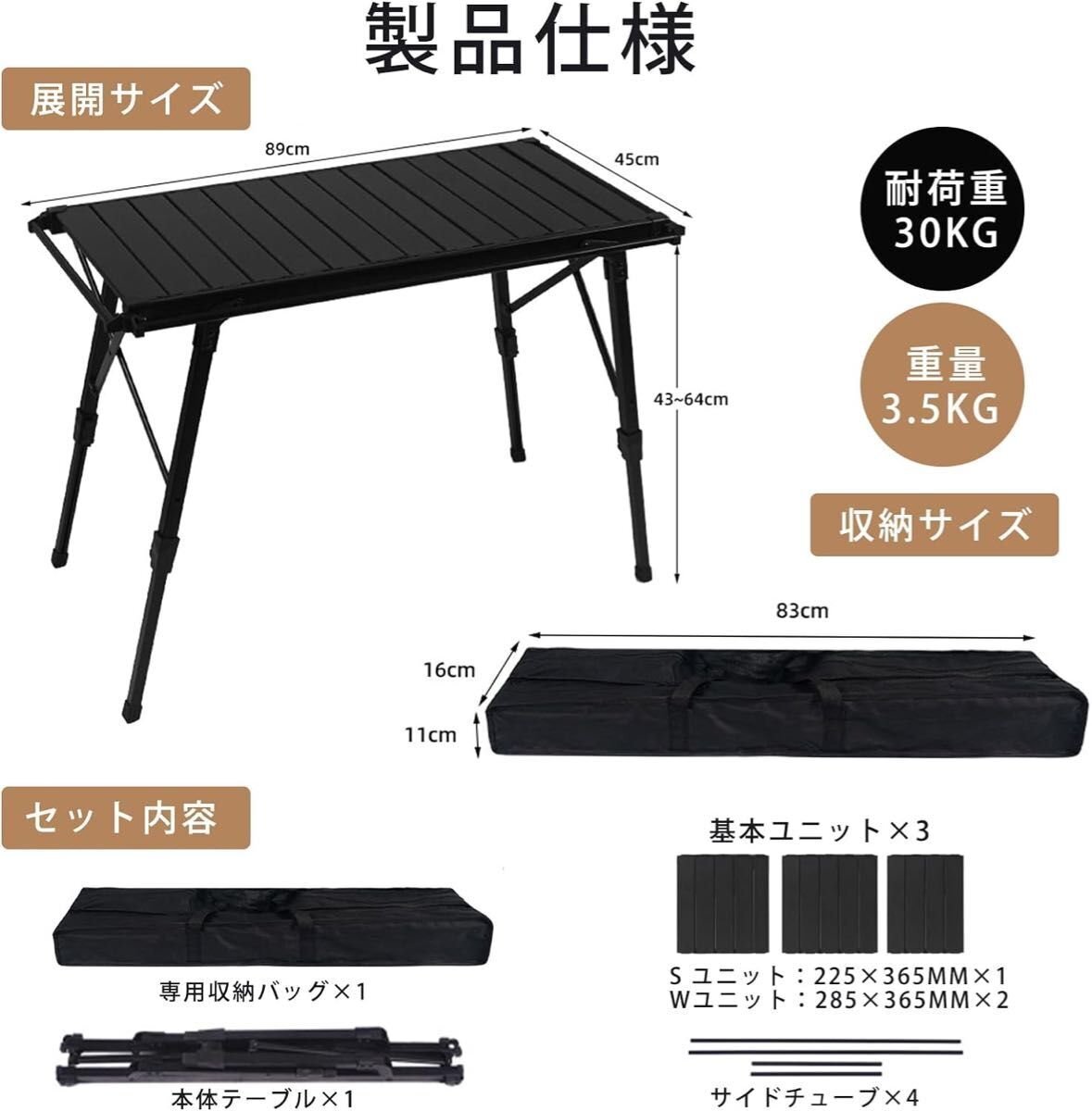 - アウトドアテーブル 折り畳み 組立不要 高さ無段階調節可 吊り下げ用サイドレール付 アルミ合金 軽量