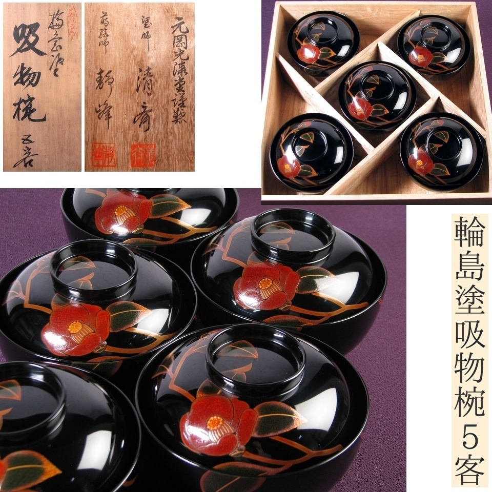 - 輪島塗吸物椀5客 [蒔絵師:静峰 塗師:清斎] 椿蒔絵 元岡光漆堂謹製 幅:13.5cm 極美品 共箱/25k037