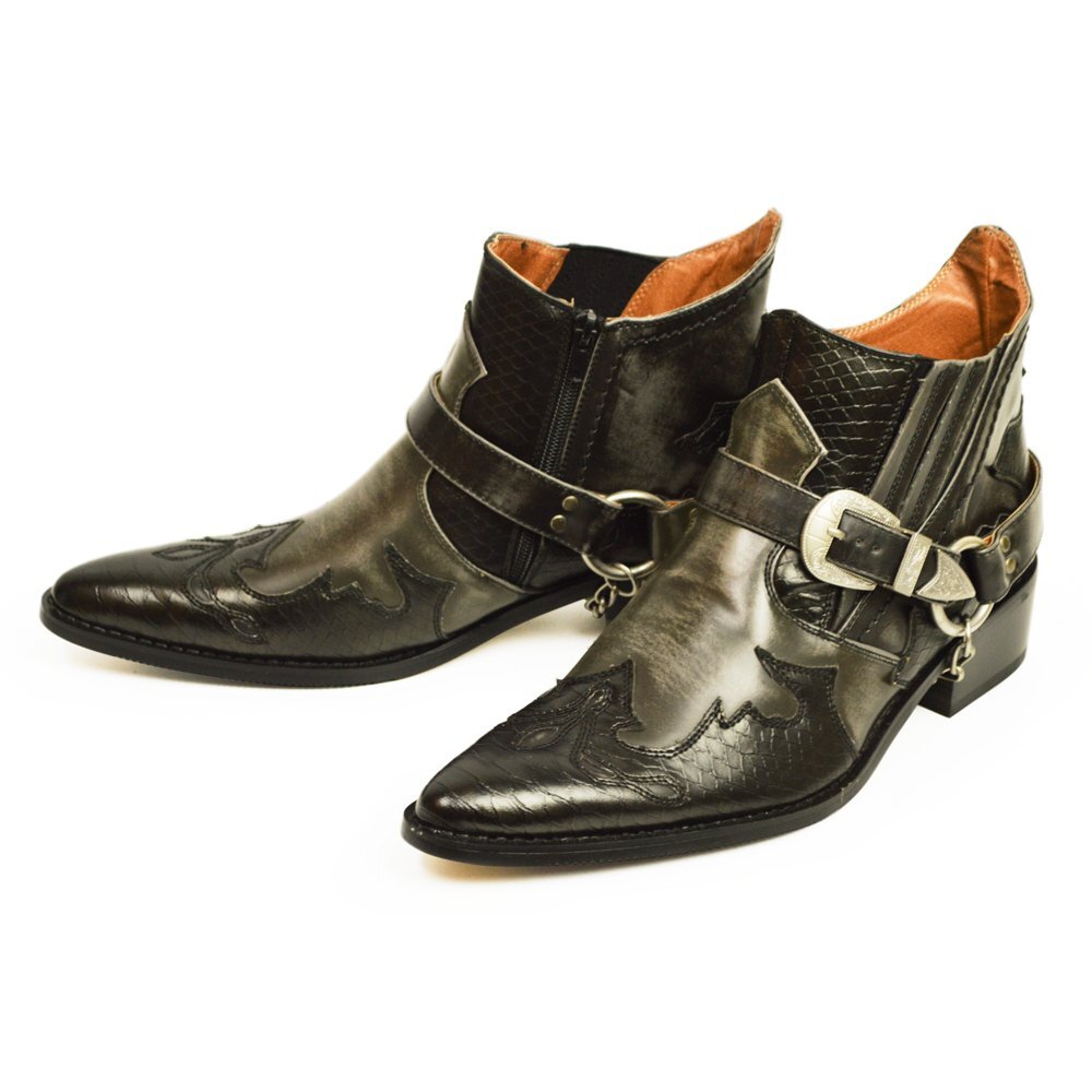 > 新品■28cm メンズ ウエスタンブーツ 脚長 ヒールアップ サイドゴア サイドジッパー ヘビ柄 パイソン バックル リングブーツ 男 靴