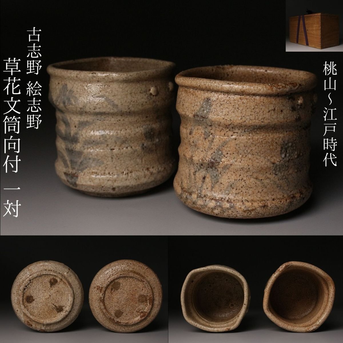 > 【LIG】桃山~江戸時代 古志野 絵志野 草花文筒向付 一対 時代箱 美濃古陶 古作逸品 数奇者垂涎の的の逸品[.WW]25.11