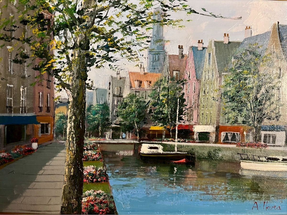 - 真作 生田明 『 アムステルダム 』 4号 油彩 額入り 額装画 風景画 真筆 肉筆画 兵庫県 SAG 水路 オランダ ヨーロッパ 風水 開運画