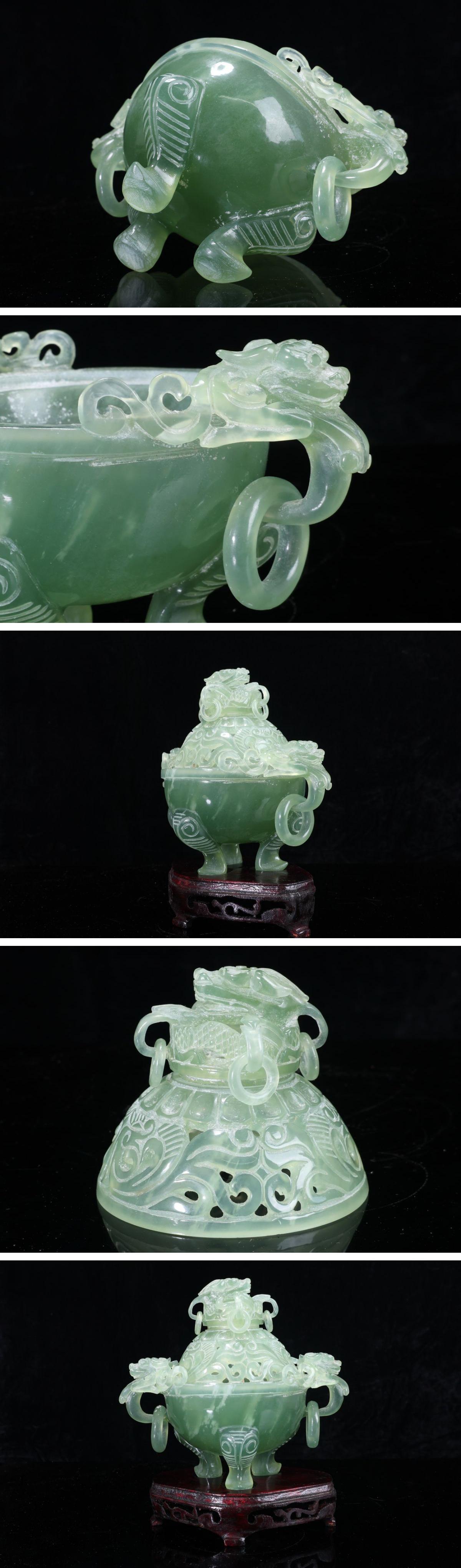 - 【珍品堂】1円から P93-V05 獣面彫 玉製 香炉 三足 中国美術 細密彫刻 龍耳遊環付 双耳 台付 箱付 重802g 置物 縁起物 希少 骨董品 古美術