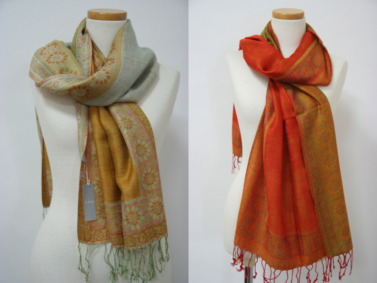 > 送料無料◆2色組◆通年タイプ◆お洒落アイテム◆お手軽ショール◆(グレーグリーン&オレンジレッド)アジアンテイスト◆ストール◆120416
