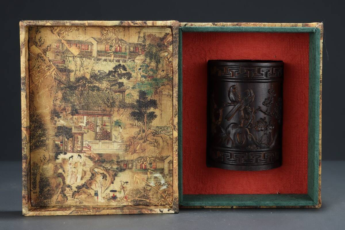 - 旧蔵 沈香木彫 喜上眉梢 筆筒 古擺件 古置物 中国古玩 骨董品 時代物 稀少唐物