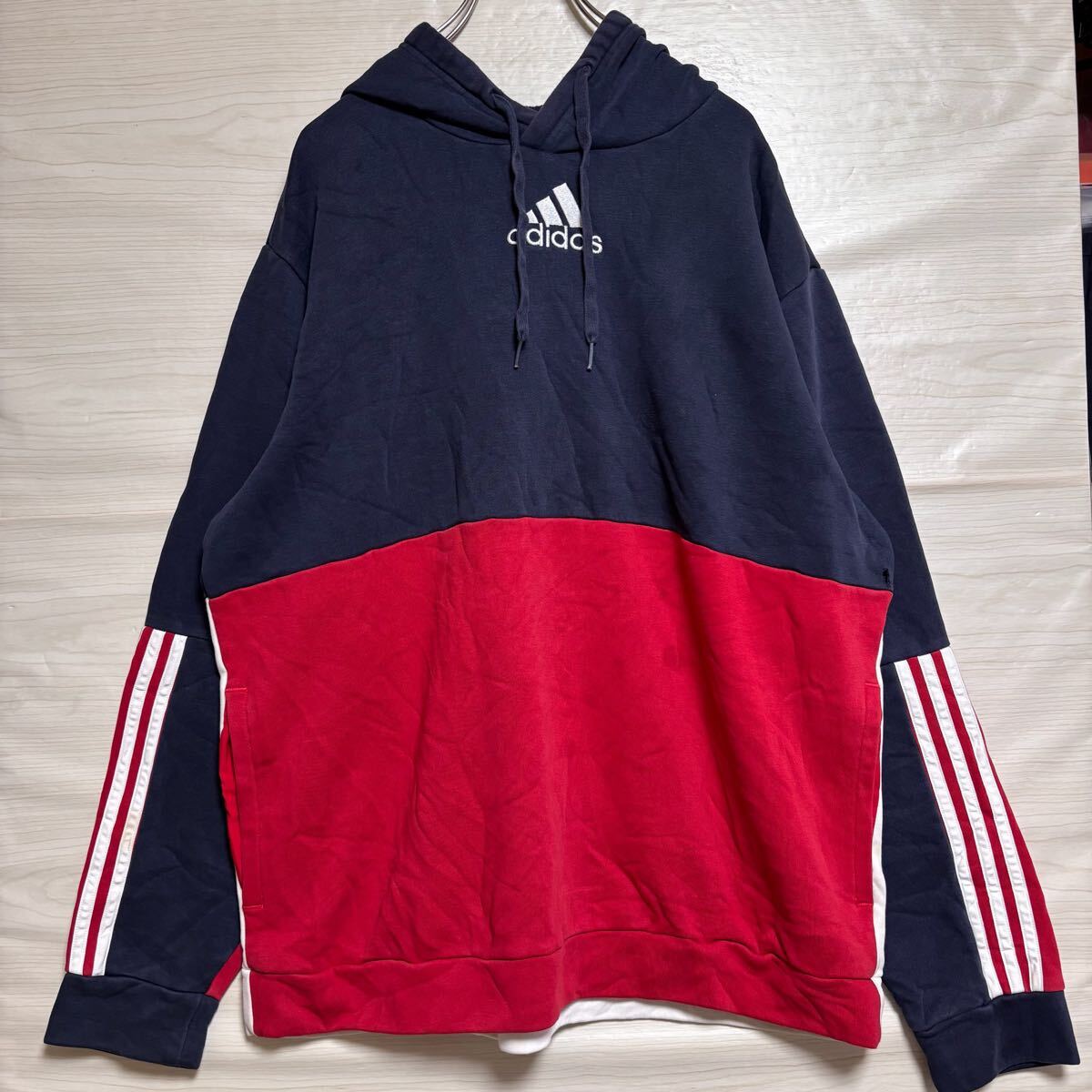 > adidas アディダス プルオーバーパーカー フーディー スウェット ロゴ刺繍 サイズXL ネイビー 紺色 コットン メンズ トップス(46)