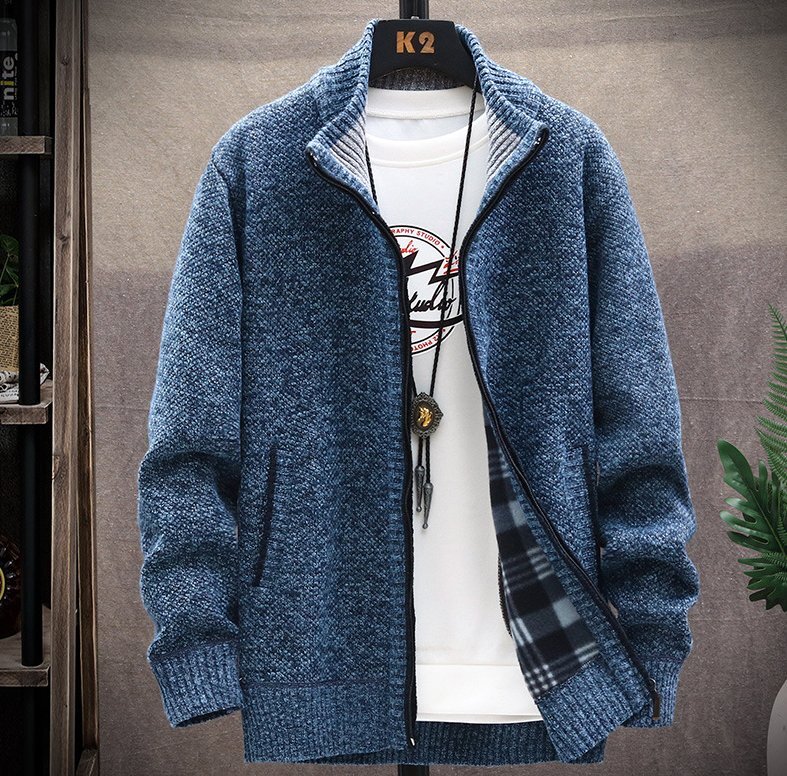 > カーディガン ニットジャケット メンズ トップス 長袖 裹起毛 ニット 切り替え 厚手 防寒 あったか ジップアップ ブルー M